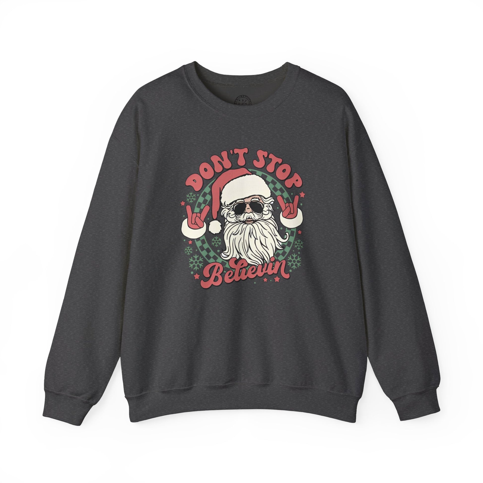 Don’t Stop Believing! Santa’s trading in his sleigh for a stage and rocking the holidays like a true legend! This design features a rockstar-style St. Nick reminding everyone to keep the faith—and the festive vibes alive. Perfect for those who love holiday cheer with a side of classic rock energy. Wear it loud, wear it proud, and let Santa take center stage this season!