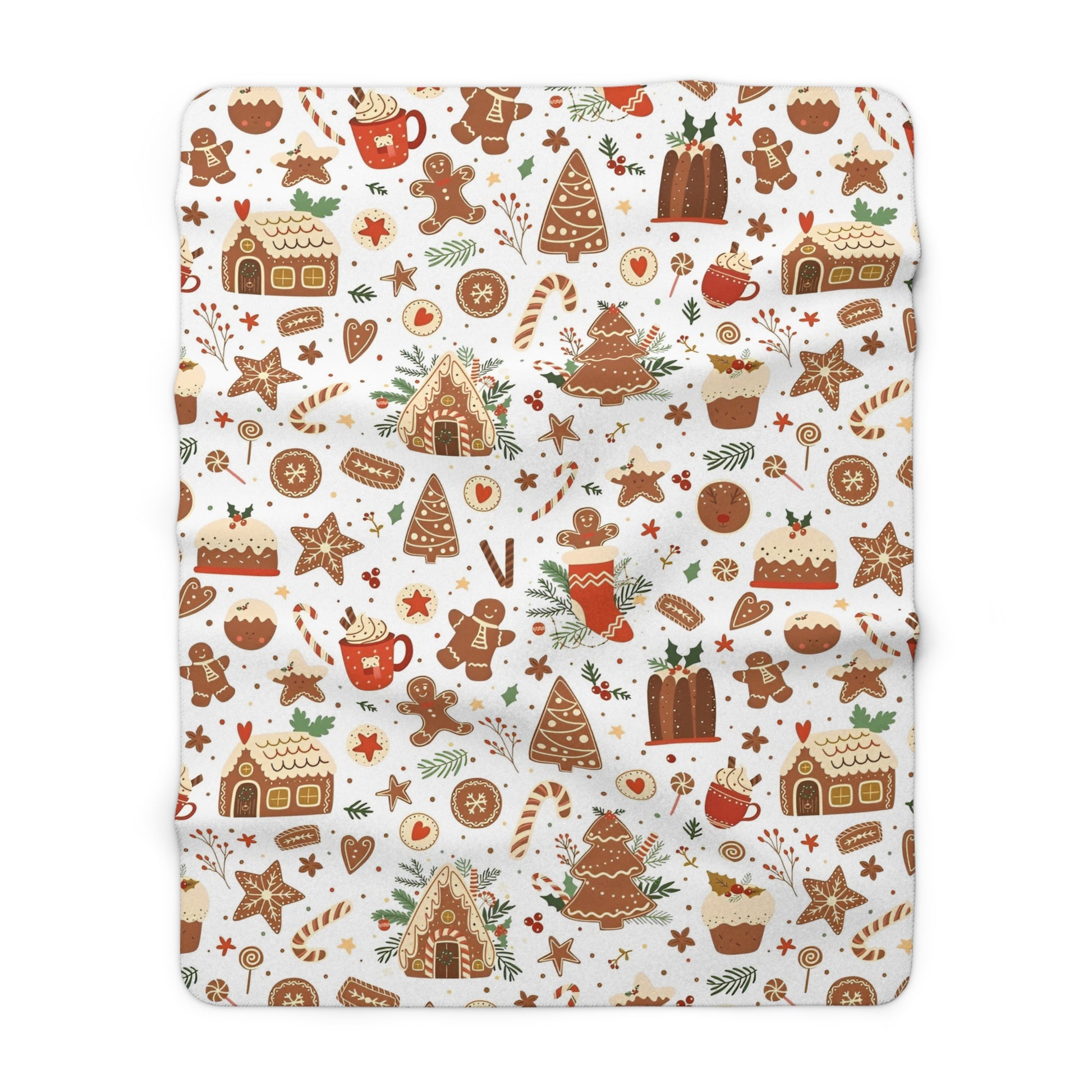 This gingerbread themed Sherpa blanket is perfect for cozying up during the Christmas season. The blanket features adorable gingerbread men, houses, cookies, and cocoa, giving off a warm and festive vibe. It is ideal for those who love the holiday spirit and enjoy snuggling up with a hot drink during winter. This blanket is a great addition to Christmas decorations and can be a thoughtful gift for friends and family.