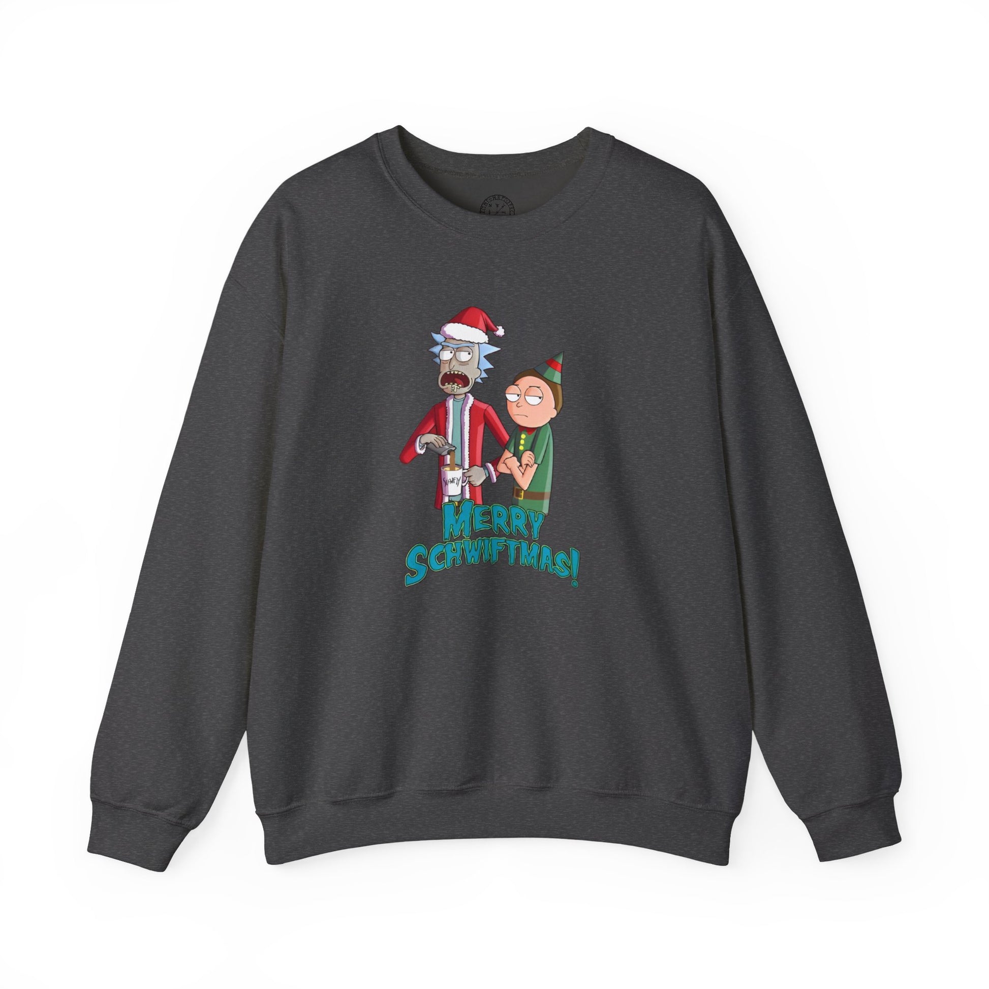 Merry Schwiftmas! Santa Rick is bringing the holiday spirit—literally—by pouring from his flask into a cup of cocoa while Morty reluctantly plays the elf. This design is perfect for fans of Rick and Morty who know that Christmas is best celebrated with a side of chaos and a splash of mischief. Whether you’re sipping cocoa or something stronger, this sweater is the ultimate way to get Schwifty this season. Wubba lubba cheers, and Merry Schwiftmas!