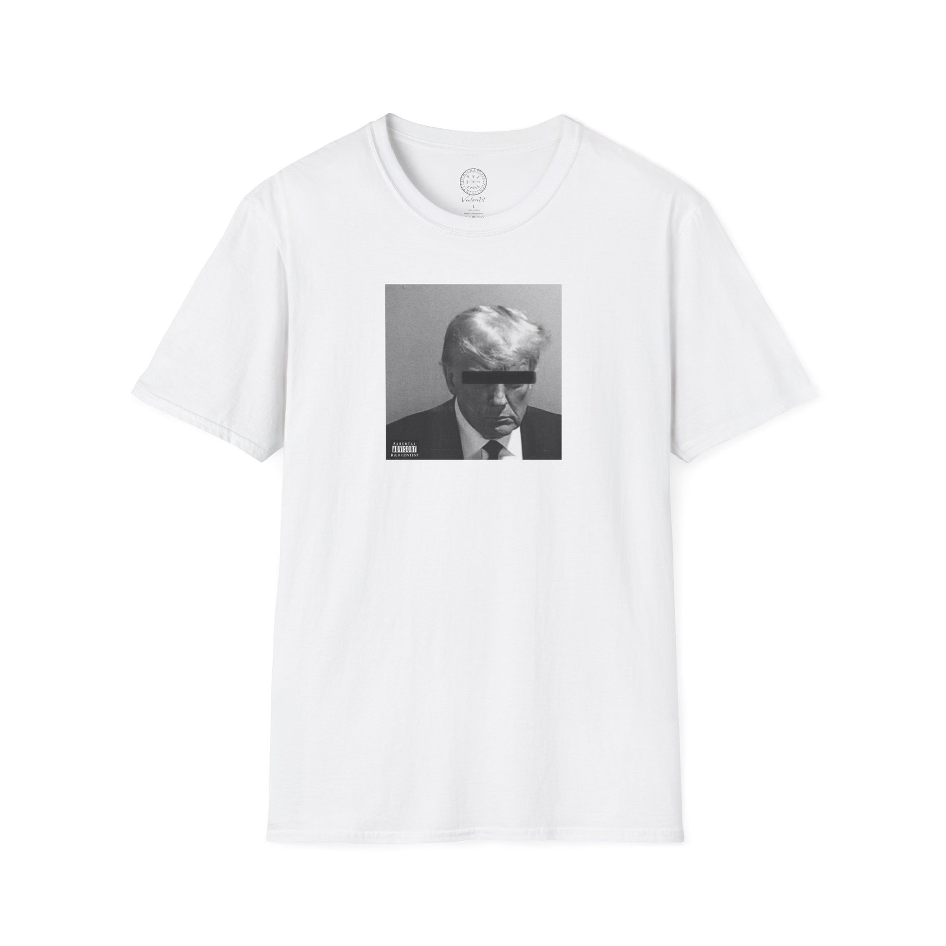 Make a bold statement with this "Trump Mugshot Album Cover" T-shirt, featuring a black-and-white rendition of Donald Trump’s infamous mugshot. With a black bar across his eyes and the iconic "Parental Advisory Explicit Content" label, this design transforms a moment of political drama into a piece of album cover-inspired art. Perfect for those who love to mix politics with pop culture, this tee is sure to spark conversations and raise eyebrows. Whether you’re making a statement, sharing a laugh, or just enjoy a bit of rebellious style, this shirt is your go-to for combining controversy with creativity.